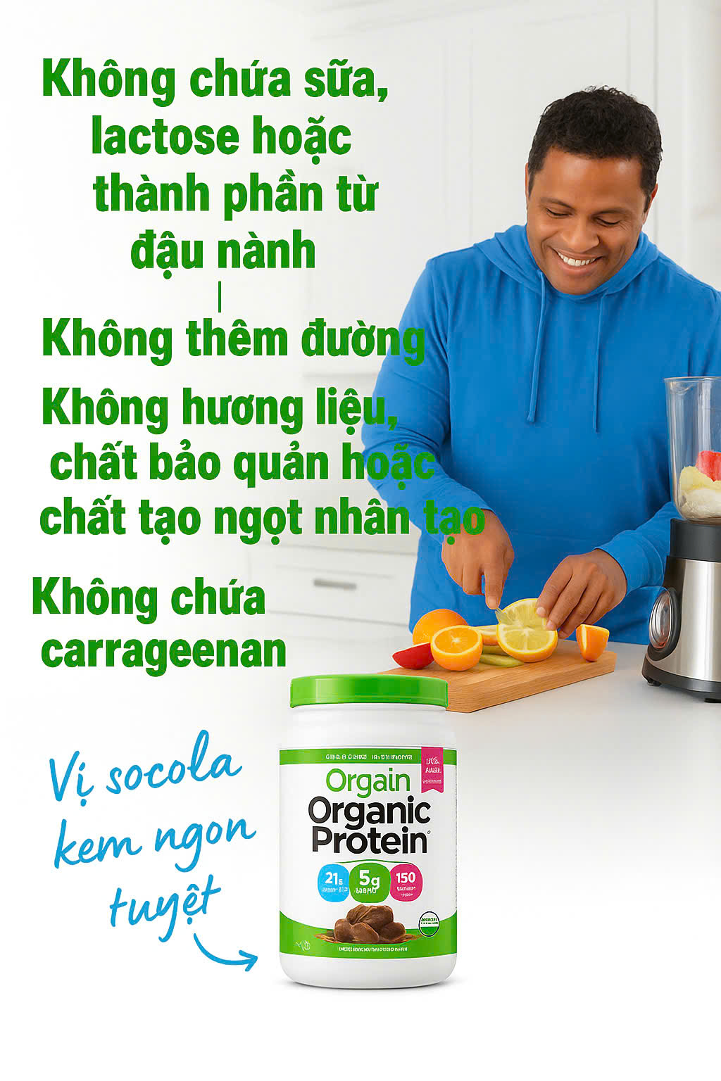 Orgain Organic Protein là dòng bột protein thực vật cao cấp đến từ Mỹ, cung cấp 21g protein hữu cơ mỗi khẩu phần từ đậu Hà Lan, gạo lứt, hạt chia và cây gai dầu. Hương vị socola fudge mịn màng, dễ uống, không chứa gluten, đậu nành hay chất bảo quản – lý tưởng cho người ăn chay, ăn kiêng và người có hệ tiêu hóa nhạy cảm.